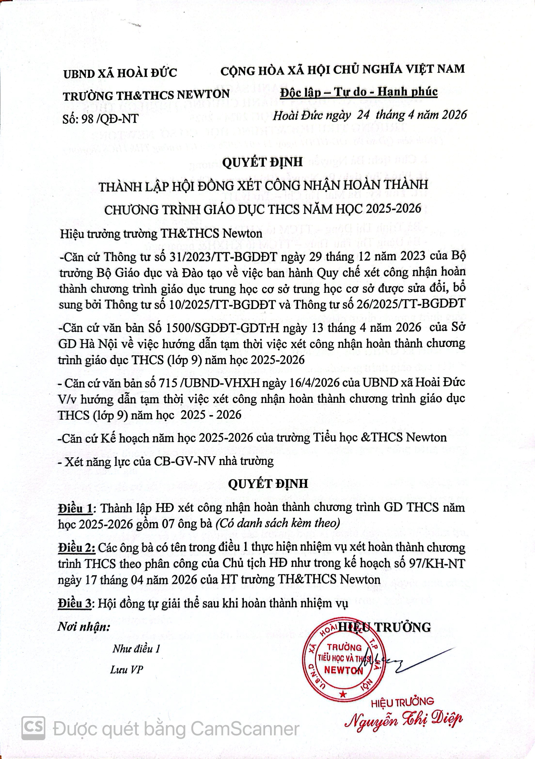 QUYẾT ĐỊNH THÀNH LẬP HỘI ĐỒNG CÔNG NHẬN HOÀN THÀNH CHƯƠNG TRÌNH GĐ THCS NĂM 2025-2026